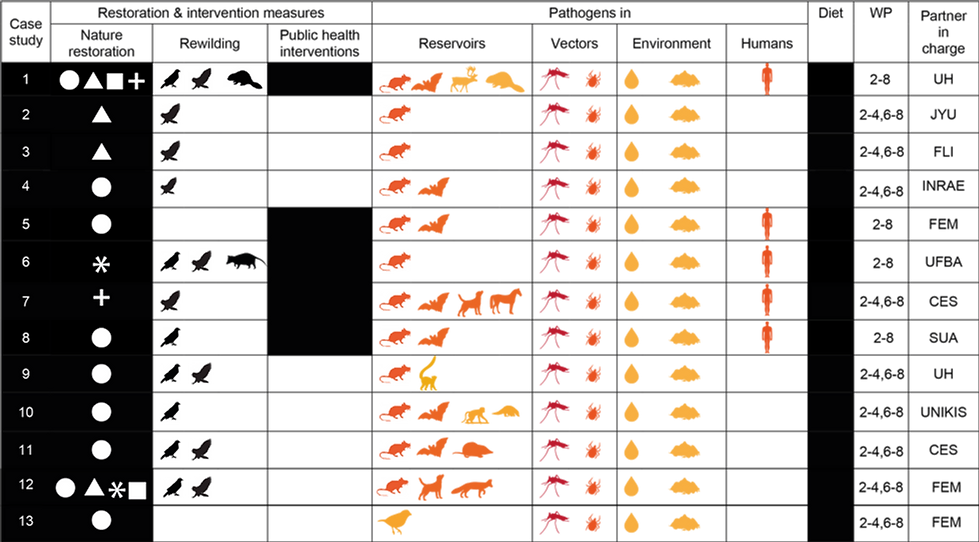 Nature restoration measures comprise reforestations (white circles), restoration of aquatic-terrestrial linkages (white triangles), wetland restoration (white square), restoration of wildlife corridors (white crosses) and improving green infrastructure (white asterisk) in rural and urban areas. Rewilding ranges from reintroducing raptors and owls to reintroduction of small to medium-sized mammals (e.g., beavers and opossums). Public health interventions include separating sewage from natural stream water by closing open sewers, improving environmental characteristics (e.g., improve trash disposal, remove water containers, improve recycling through local cooperatives) and putting up mosquito screens.