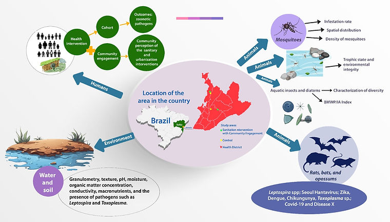 Salvador is the fifth largest Brazilian city (~2.5 million inhabitants). Large portions of the population live in poor urban communities lacking urban infrastructure/services (sanitation, trash collection, pavement, urban planning), presenting chronic issues of overcrowding, pests (e.g.: mosquitoes, rats), and environmental risk such as flooding-prone open sewer canals. The study areas are undergoing the implementation of simplified closed sewer systems (condominial sewer, an innovative method linking multiple households to integrated branches of sewage piping), a process happening with deliberative and executive participation of the residents of the intervened regions. Our case study aims to describe the effects of sewer systems in reducing impact on biodiversity loss and pathogen circulation risk in the animal-human-environment interface.